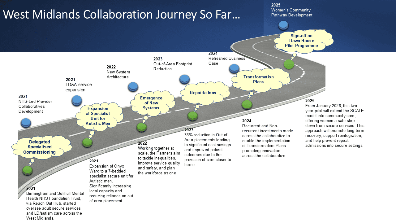 In October 2021, Birmingham and Solihull Mental Health NHS Foundation Trust, via Reach Out Hub, started overseeing adult secure services and LD/autism care across the West Midlands.