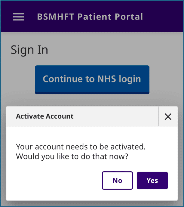 Return to the Patient Portal, login using your NHS login details, and click Yes on the activation message.