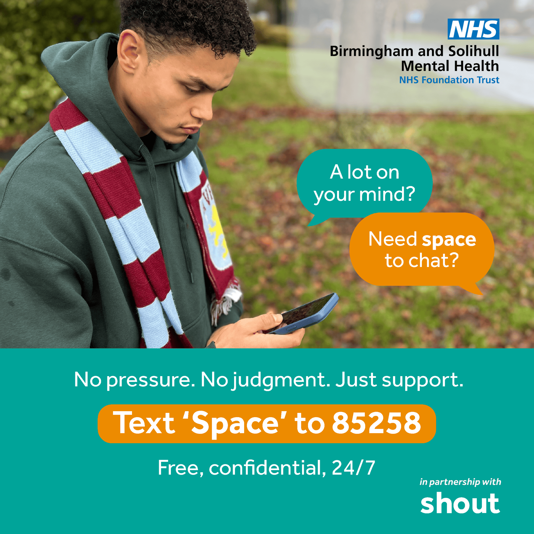 Texting ‘Space’ to 85258 is free, confidential and available 24/7.